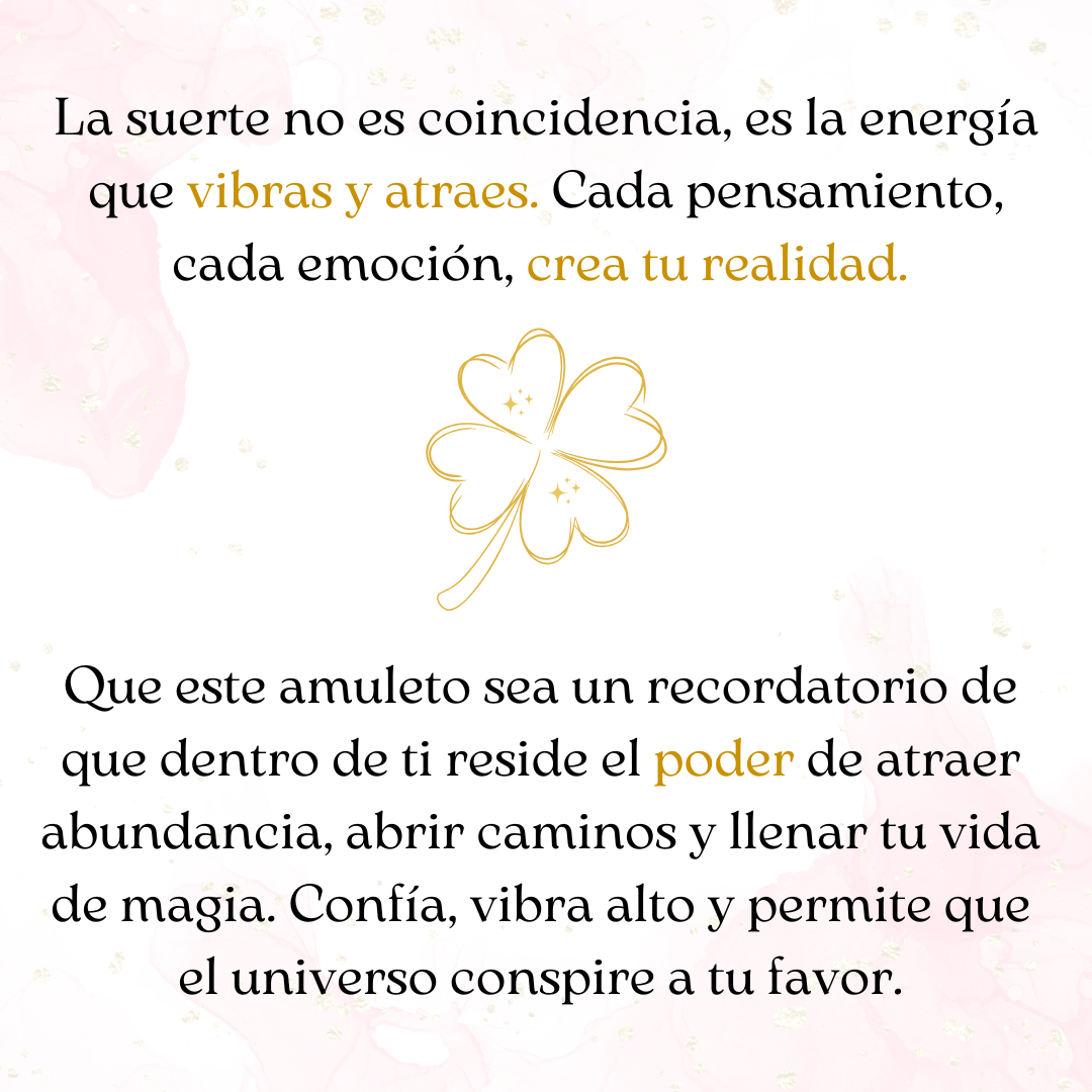 " La suerte no es coincidencia, es la energía que vibra y atrae. Cada pensamiento, cada emoción, crea tu realidad. Que este amuleto sea un recordatorio de que dentro de ti reside el poder de atraer abundancia, abrir caminos y llenar tu vida de magia. Confía, vibra alto y permite que el universo conspire a tu favor."
