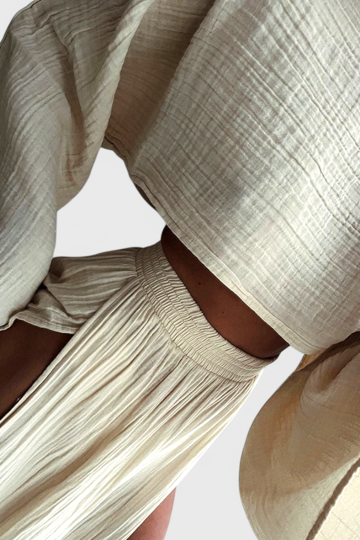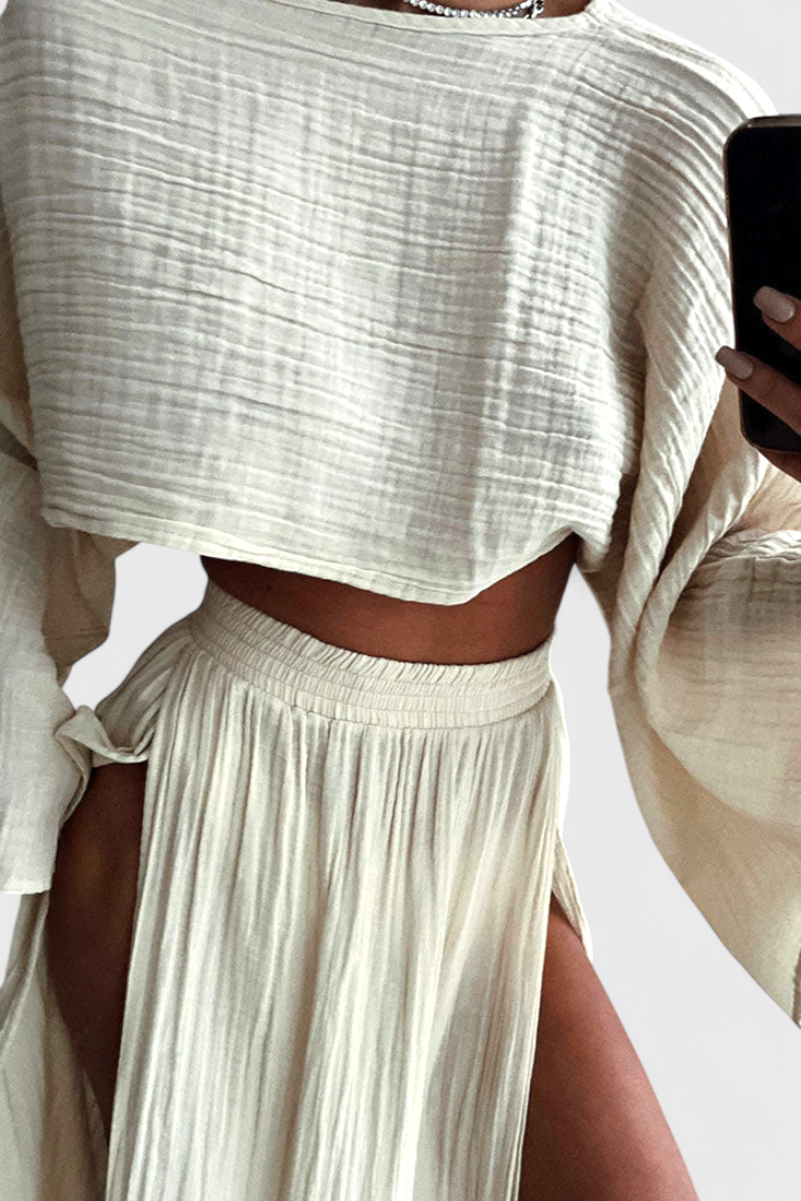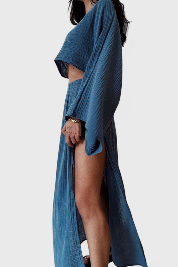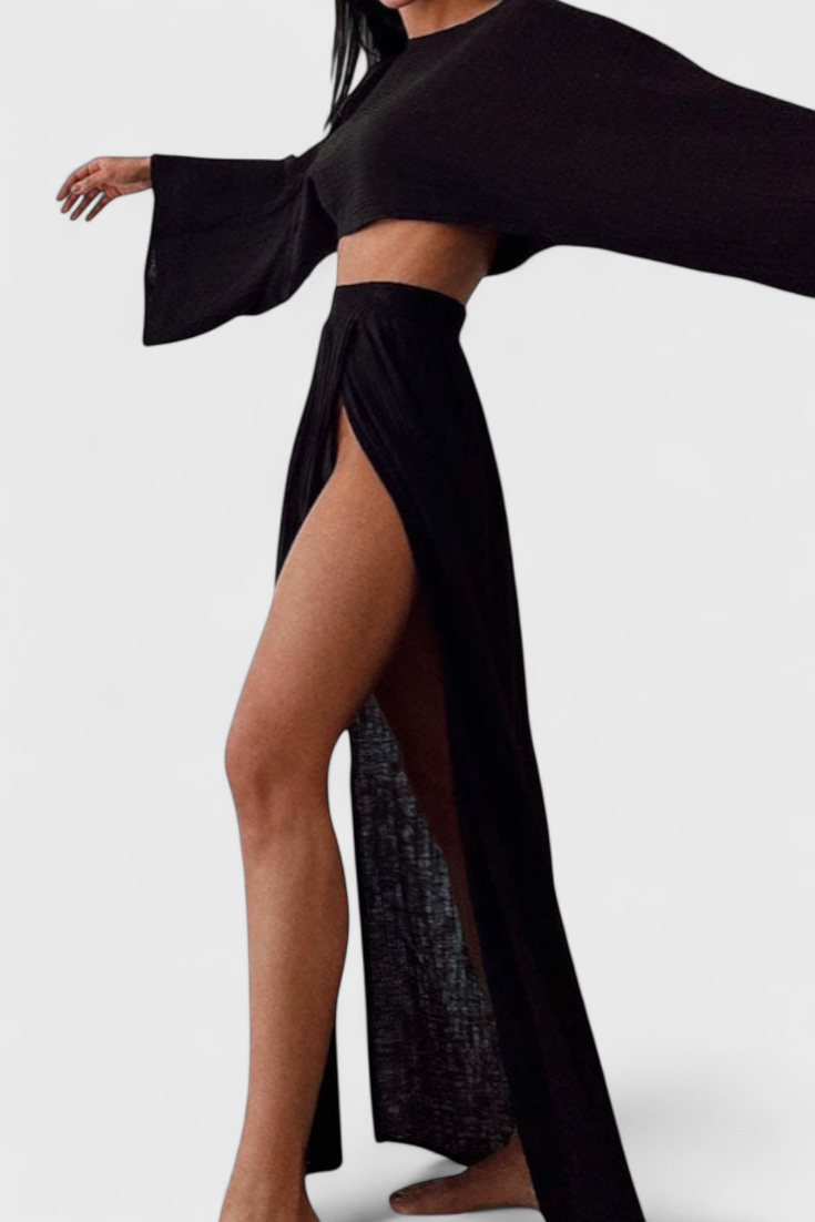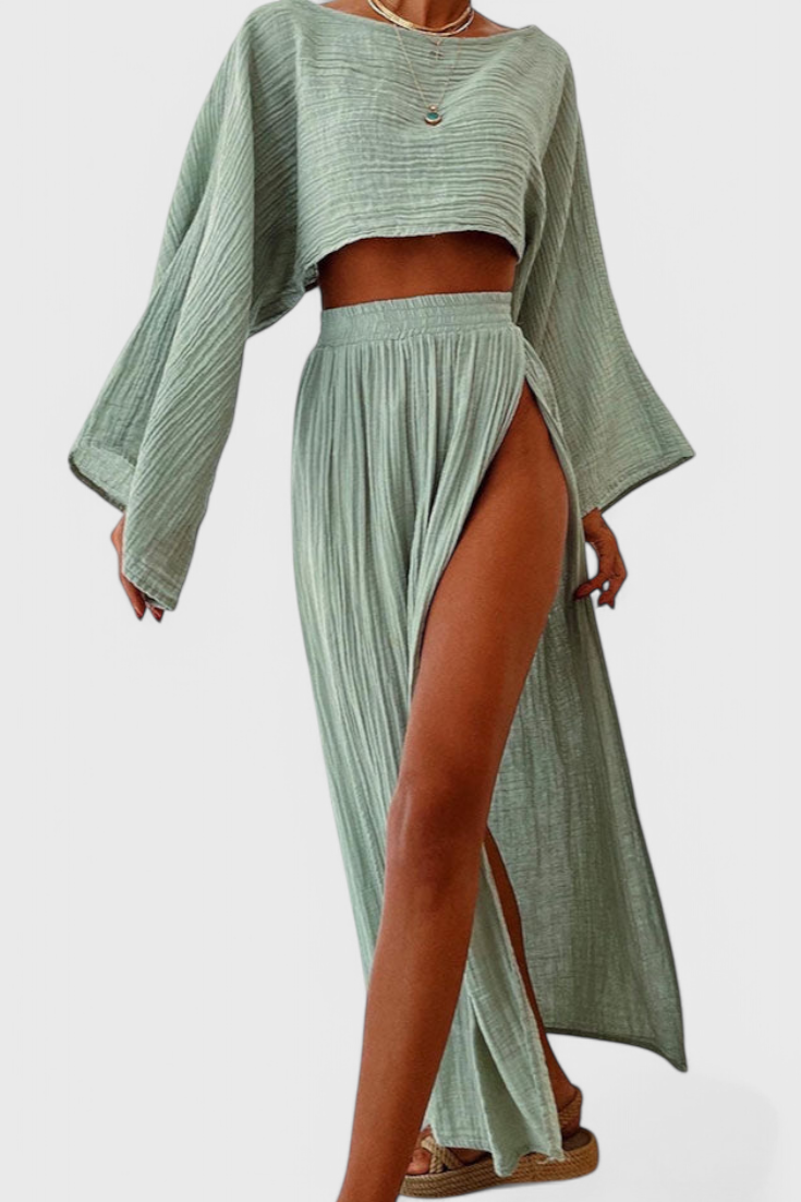 Ligero, sofisticado y hecho para impresionar—el conjunto Martha fusiona estilo moderno con una fluidez envolvente. Su top corto aireado y la falda con abertura lateral crean un equilibrio perfecto entre elegancia y frescura, ideal para días soleados o noches especiales.